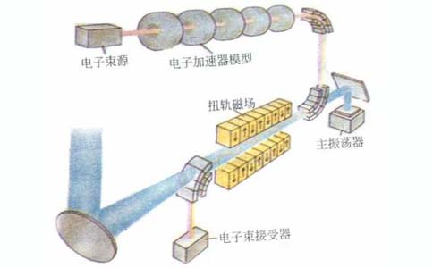 從加速器輸出的相對論電子束橫穿過周期性變化的波振器靜磁場。磁場方向與電子束垂直,故穿過的電子束被迫進行橫向振蕩,并向前方發射磁軔致輻射。在高能電子和光子的散射過程中,電子運動方向上的散射光子的頻率可由能量和動量守恒定律決定,波振器使聚焦的電子束在與光子束相互作用的整個過程中,始終保持在直線方向上。當電子束和光子束密度足夠大時,便形成受激散射,產生自由電子激光。自由電子激光器的輸出激光波長與電子能量有關,改變電子束的加速電壓就可以改變激光波長,這稱為電壓調諧。其調諧范圍很寬,原則上可以獲得任意波長的激光。