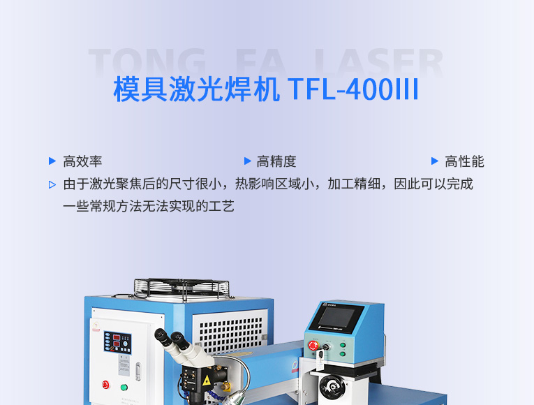 通發激光TFL-400Ⅲ大功率模具激光焊機,比普通激光焊機修復模具效率快1.5-2倍,適合0.3-0.6激光焊絲,大功率更適合修復鈹銅模具、鋁模等較難修復的模具。