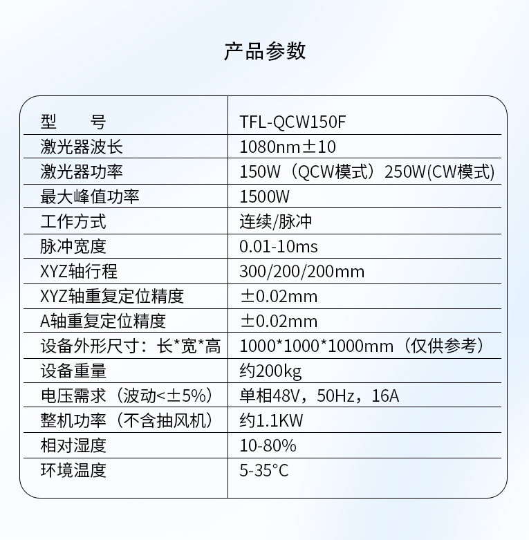 激光器功率 150W(QCW模式)250W(CW模式)